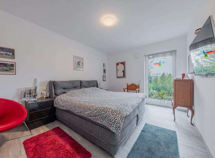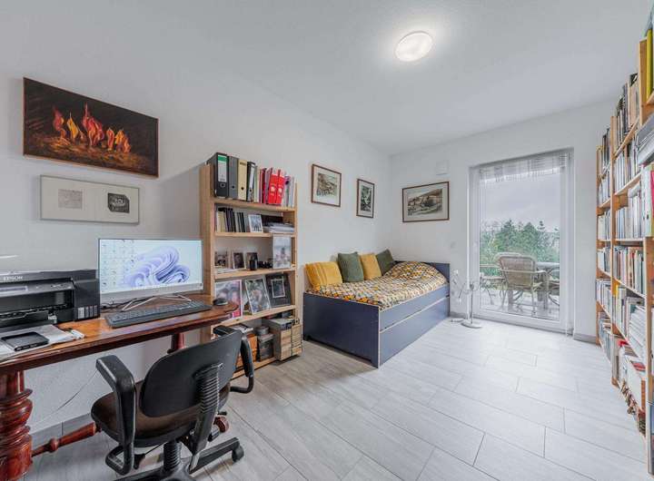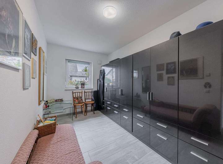 Zur Verfügung stehen aktuell drei Schlafzimmer sowie eine geräumige Ankleide, die im ursprünglichen Grundriss als zusätzliches Zimmer vorgesehen war. Da im Hauptschlafzimmer genügend Stellfläche für einen großen Kleiderschrank vorhanden ist, lässt sich die Ankleide unkompliziert in ein vollwertiges viertes Zimmer umwandeln. Dadurch ergibt sich eine bemerkenswerte Flexibilität, die verschiedenen Lebenssituationen gerecht wird – vom Familienalltag bis hin zu Homeoffice- oder Gästebedarf.