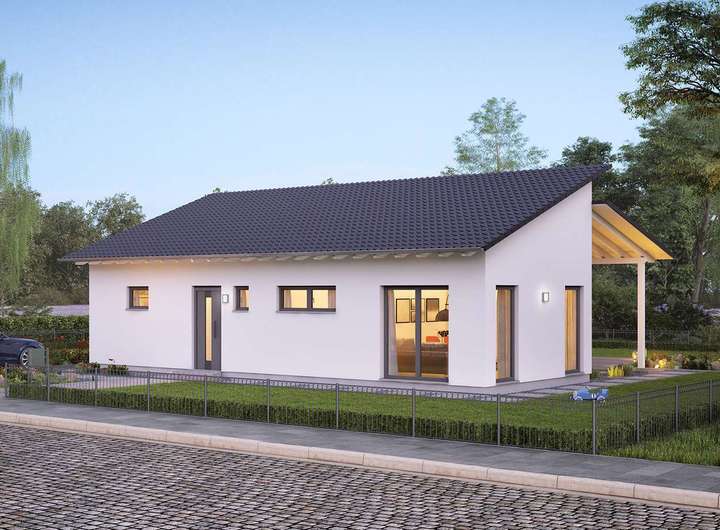 Der attraktive Bungalow ComfortStyle 10.02 P mit Pultdach bietet ideenreichen Baufamilien auf 108 m² viele Möglichkeiten, die eigenen Vorstellungen umzusetzen. Ein echtes Highlight ist die überdachte Terrasse mit direktem Zugang aus dem großzügigen Wohn-, Ess- und Küchenbereich. An schönen Tagen lässt sich so der Wohnraum ins Freie hinaus verlängern. Daneben erhöhen das geräumige Bad und viele intelligent integrierte Stellflächen oder Stauräume den individuellen Wohnkomfort. Nicht zuletzt überzeugt das ComfortStyle 10.02 P mit einer klaren, geradlinigen Architektursprache.