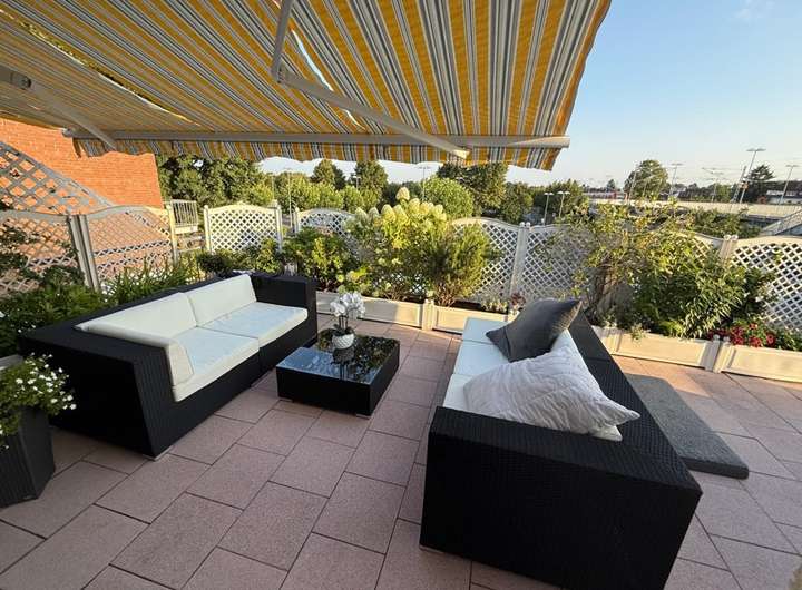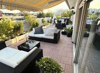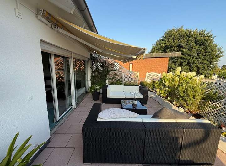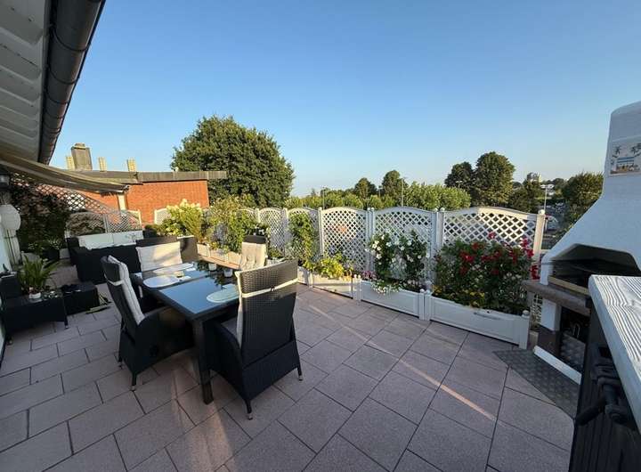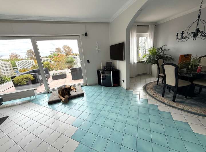 Penthouse mit großem Terrassenbereich und Weitblick, 4 Zimmer, Einbauküche, Tageslicht Wannen -und Duschbad, Gäste WC im I.OG. Weitere Wohnfläche von 54 m² zum Ausbau vorbereitet im DG. Nebengebäude, Lagerflächen, 2 Garagen + 8 PKW - Stellplätze.