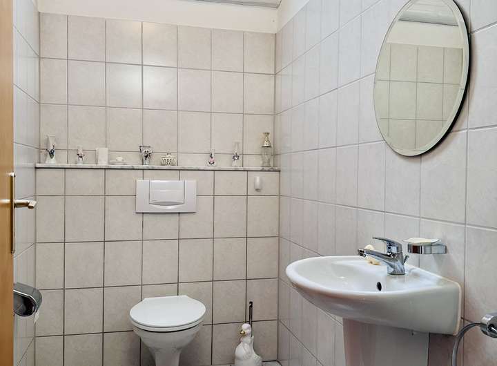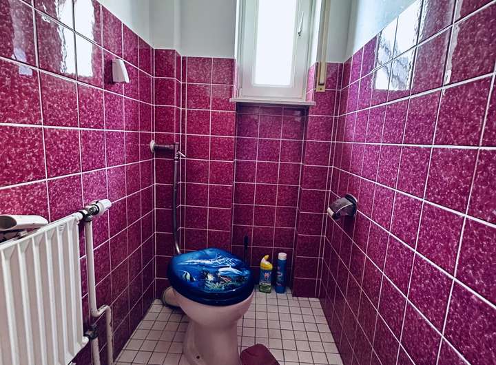 Duschbad mit WC und Waschbecken– deckenhoch gefliest, mit Fenstern