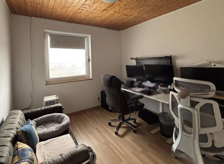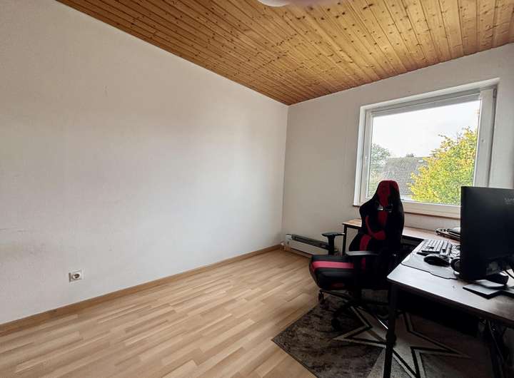 Im Erdgeschoss empfängt Sie ein großzügiger Wohn- und Essbereich, der durch große Fensterflächen lichtdurchflutet ist und einen direkten Zugang zur Terrasse und in den Garten bietet. Die angrenzende Küche ist funktional geschnitten und verfügt über eine praktische Vorratskammer sowie einen Hauswirtschaftsraum. Ein weiteres Zimmer im Erdgeschoss kann flexibel als Arbeits-, Gäste- oder Hobbyzimmer genutzt werden.