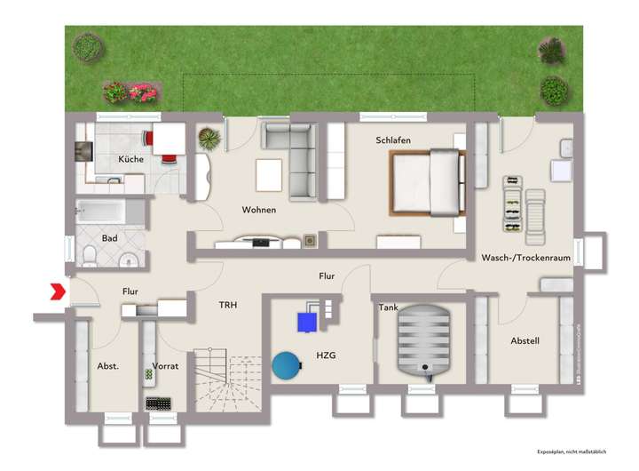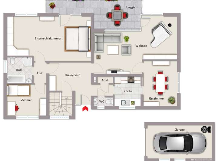 Die beigefügten Grundrisszeichnungen sind nicht maßstabsgetreu. Bei dem eingezeichneten Mobiliar handelt es sich um Einrichtungsbeispiele. Wir weisen ausdrücklich darauf hin, dass wir für die inhaltliche Richtigkeit der übermittelten Daten des o.g. Objektes nicht haften, da diese vom Eigentümer lediglich zur Verfügung gestellt wurden.