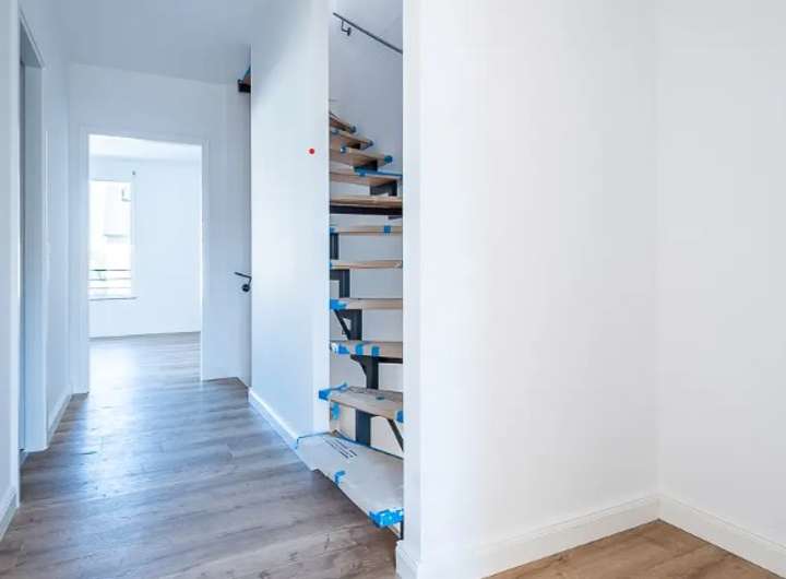 - Hochwertiger Eichenfußboden und perfekt darauf abgestimmte Innentüren aus Eiche schaffen ein durchgehend harmonisches Wohnambiente. Ergänzt wird dies durch edle Eichentreppenstufen, die das Gesamtbild stilvoll abrunden