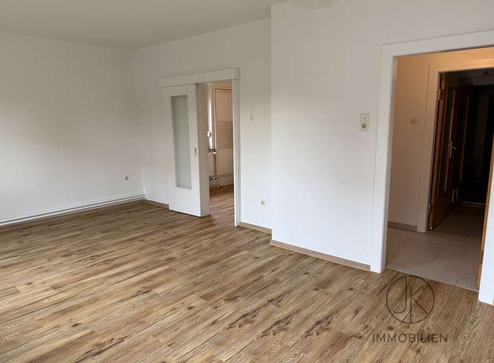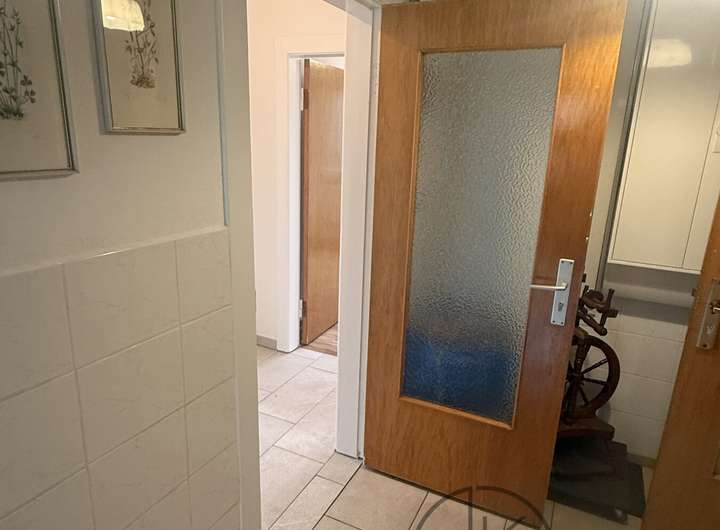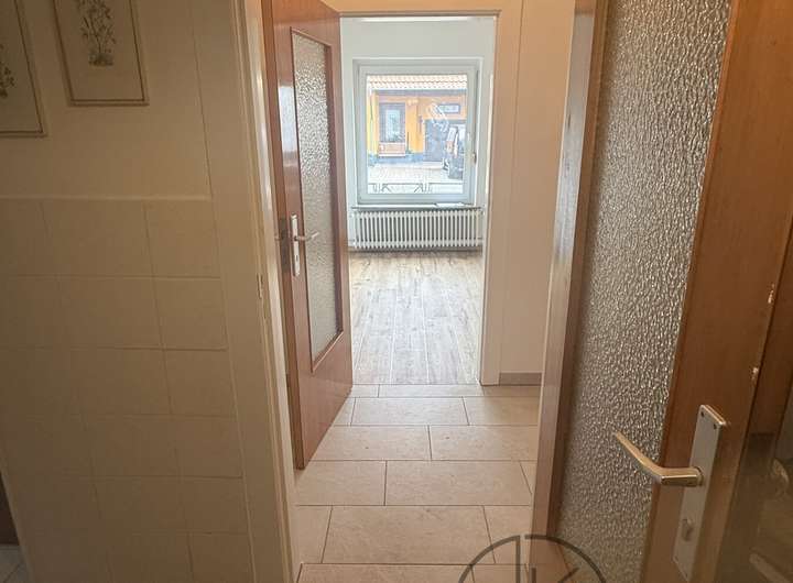 Die Küche schließt an das Wohnzimmer an und ist sowohl über den Flur als auch über eine Schiebetür vom Wohnzimmer aus zugänglich. Durch die Schiebetür kann der Raum flexibel geöffnet oder getrennt genutzt werden. Das modernisierte Badezimmer liegt angrenzend an die Küche und ist ausschließlich über diesen Bereich erreichbar.