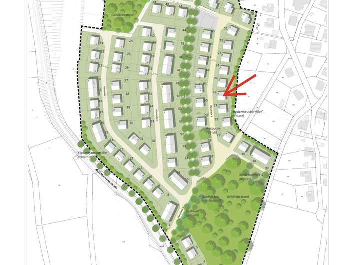 Das hier zum Verkauf angebotene Grundstück mit der Parzellennummer 76 umfasst 530 m² und liegt im westlichen Bereich des Neubaugebietes.