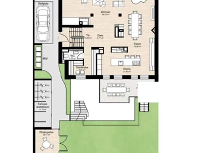perfekt für gesellige Abende und ein modernes, offenes Wohngefühl. Direkt vor der Küche befindet sich eine große Sonnenterrasse mit Treppe hinunter in den Garten, die nahtlos den