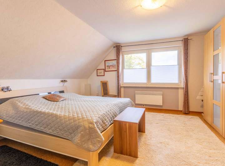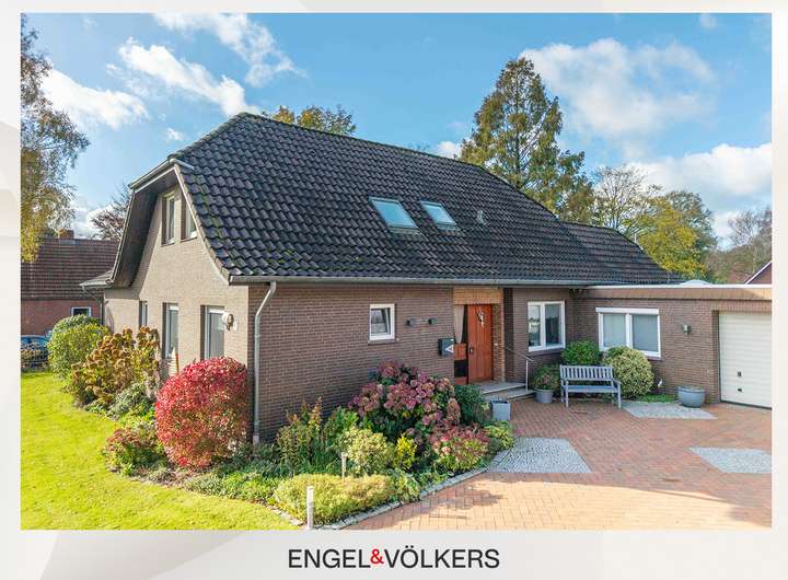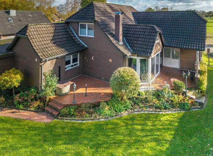 In ruhiger Wohnlage von Moormerland-Hatshausen präsentiert sich dieses freistehende Einfamilienhaus als überzeugende Kombination aus Wohnkomfort, Funktionalität und gepflegtem Ambiente. Das ursprünglich im Jahr 1974 errichtete Objekt wurde 1982 durch eine harmonisch integrierte Aufstockung erweitert und bietet heute eine großzügige Wohnfläche von ca. 170 m² auf einem ca. 960 m² großen Grundstück. Bereits der Eingangsbereich empfängt mit einer angenehmen Großzügigkeit. Der zentrale Flur mit offener Holztreppe erschließt die durchdacht konzipierten Räume des Erdgeschosses. Herzstück ist der helle Wohnbereich mit Kamin, der an kühleren Tagen wohlige Wärme und eine besondere Wohnatmosphäre schafft. Das angrenzende Esszimmer fungiert als stilvolle Verbindung zur modernen Einbauküche (BJ 2021), die mit hochwertigen Geräten und klarem Design überzeugt. Praktische Ergänzungen wie ein voll ausgestatteter Hauswirtschaftsraum, ein separater Vorratsraum sowie der direkte Zugang zur Garage mit elektrischem Sektionaltor unterstreichen die funktionale Qualität dieser Immobilie. Die Garage verfügt zusätzlich über einen integrierten Werkstattbereich sowie einen Ausgang in den Garten. Das Erdgeschoss umfasst darüber hinaus ein modernisiertes Tageslichtbad mit ebenerdiger Dusche, ein separates Gäste-WC, ein großzügiges Schlafzimmer sowie zwei weitere Zimmer mit vielseitigem Nutzungspotenzial – ideal als Home-Office, Gäste- oder Hausarbeitsbereich. Das Obergeschoss beherbergt drei weitere, großzügige Zimmer sowie ein Duschbad – perfekt geeignet als Kinder- oder Jugendtrakt, Rückzugsräume oder für die Nutzung als separate Arbeitsbereiche. Die Immobilie wurde in den vergangenen Jahren kontinuierlich modernisiert: Ab 2018 erfolgten umfassende Erneuerungen an Bädern, Bodenbelägen (Küche, Schlafzimmer, Kinderzimmer) und Fenstern. Die Rollläden im Erdgeschoss wurden 2019 ersetzt, im Obergeschoss sind die Rollläden inzwischen ebenfalls modernisiert worden. Beheizt wird das Haus über eine elektrische Fußbodenheizung und elektrische Wandheizkörper im Erdgeschoss sowie über Nachtspeicheröfen im Obergeschoss. Der Außenbereich präsentiert sich ebenso gepflegt wie durchdacht gestaltet: Eine überdachte Terrasse, ein Gartenhaus und ein geschützter Wäscheplatz fügen sich harmonisch in das grüne Gesamtbild ein und bieten Raum zur Erholung im Freien. Diese Immobilie vereint ein großzügiges Raumkonzept mit wertiger Ausstattung und einem gepflegten Gesamtzustand – ideal für Familien oder Paare mit Platzbedarf, die ein ruhiges und gleichzeitig gut angebundenes Zuhause suchen.