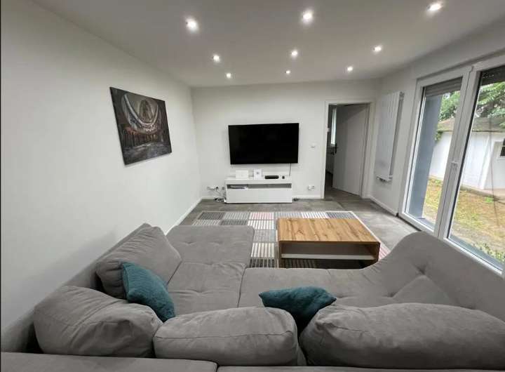 Es handelt sich hier um ein kleines Haus mit eigenem, separaten Eingang sowie eigenem Garten. Das Haus bietet ein helles Wohnzimmer mit offener Küche, ein gemütliches Schlafzimmer sowie ein modernes Badezimmer.