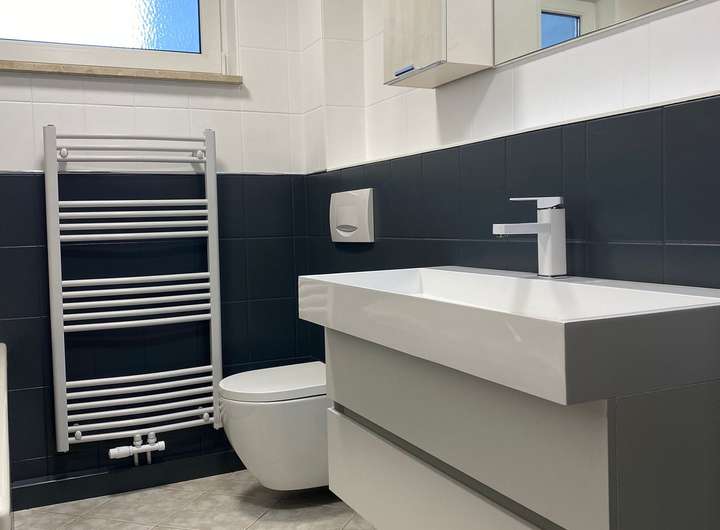 Modernes Bad mit Badewanne und zusätzlich modisches Gäste-WC mit Dachfenster