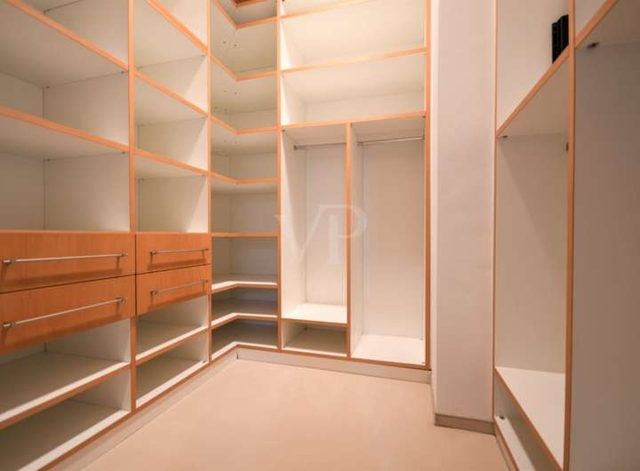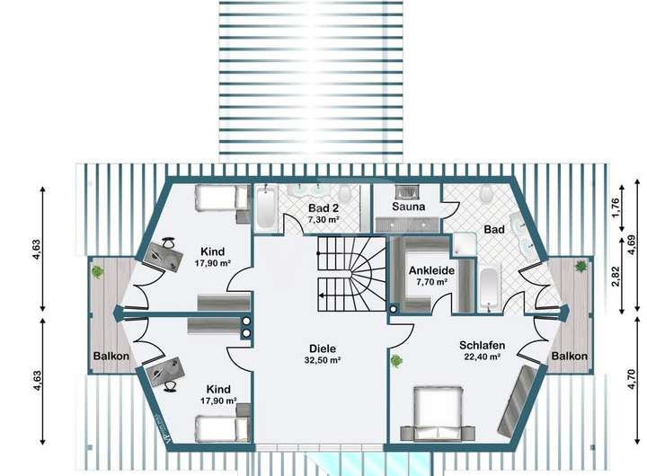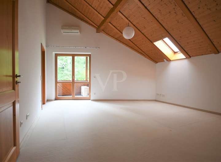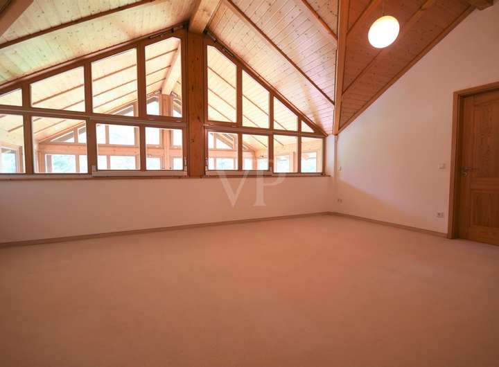 Die Räume im Obergeschoss öffnen sich bis unter das Dach und sind mit hellen, segmentierten Holzdecken gestaltet, die sofort eine warme Atmosphäre erzeugen. Die außergewöhnlich großzügige Diele bietet einen traumhaften Blick durch den oberen Teil des Wintergartens in den Garten. Von hier gehen zwei Zimmer und ein eigenes Bad ab, ideal als Kinder- oder Gästezimmer. Das große Schlafzimmer mit eigenem Bad, Sauna und anschließendem Ankleideraum bildet eine private Wohlfühloase. Sowohl die beiden westlichen Zimmer als auch das Schlafzimmer und das Elternbad im Osten verfügen über einen eigenen Balkon unter dem geschützten Dachüberstand. Jeder dieser Plätze lädt dazu ein, den Tag mit Sonne oder Abendlicht zu genießen.