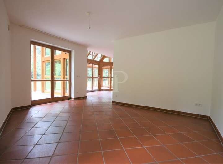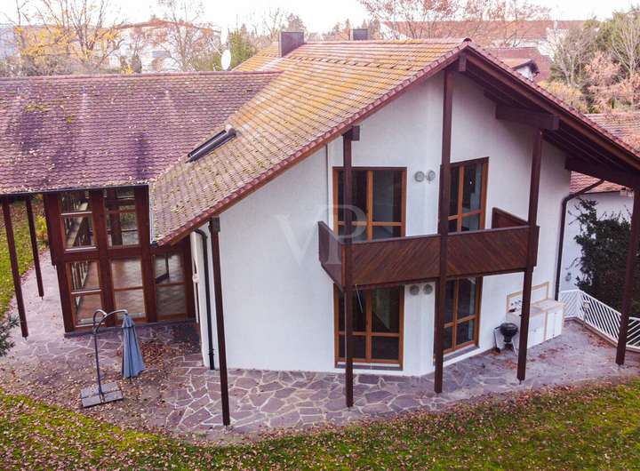 Das Haus selbst strahlt mediterranen Charme aus. Holz prägt Fenster, Wintergarten und die eleganten Stützen der Dachüberstände. Die großzügigen Glasflächen lassen den Innenraum in warmem Tageslicht erstrahlen, während die tiefen Dachüberstände im Sommer eine wohltuende Kühle bewahren. Schattenzonen entstehen ganz natürlich und sorgen überall für ein angenehmes Raumklima. Selbst der Wintergarten bleibt, bis auf wenige außergewöhnlich heiße Tage, angenehm temperiert. Die klare Ausrichtung nach Süden lässt den Wohnbereich von Südwest bis Südost in einem harmonischen Lichtspiel erstrahlen.
