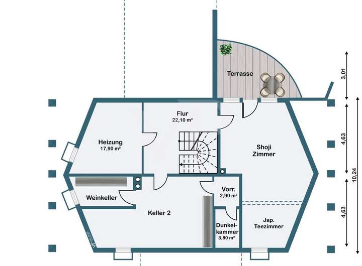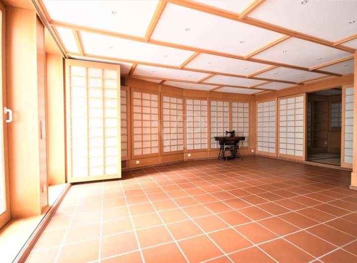 Das Untergeschoss erstreckt sich unter dem gesamten Haus und bietet außergewöhnlich viel Platz. Neben einem großen Stauraumbereich befindet sich hier ein separater Weinkeller, der Genussliebhaber begeistert. Ein weiteres Zimmer wurde im Stil japanischer Innenarchitektur gestaltet. Verschiebbare Shoji-Wände verleihen ihm eine ruhige, harmonische Ausstrahlung. Drei raumhohe Fenstertüren führen auf eine nordöstlich gelegene Kellerterrasse, die durch eine Treppe wieder mit dem Garten verbunden ist. Im Inneren des Raumes befindet sich zudem ein kleines, vollständig abgetrenntes Tee-Zimmer, das zu besonderen Momenten der Ruhe einlädt.