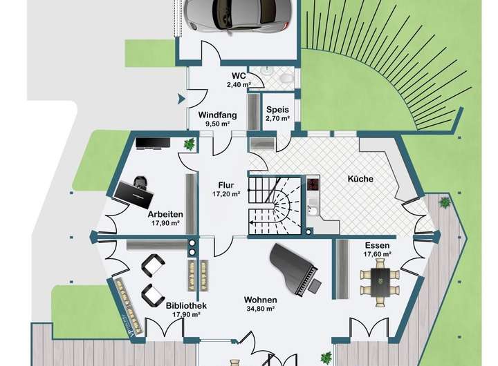 Kommend von der Sticheinfahrt öffnet sich ein großzügiger, gepflasterter Vorplatz, der Sie einladend empfängt. Von hier fahren Sie direkt in die sehr geräumige Doppelgarage und gelangen anschließend ebenerdig und trockenen Fußes in Ihr Zuhause.