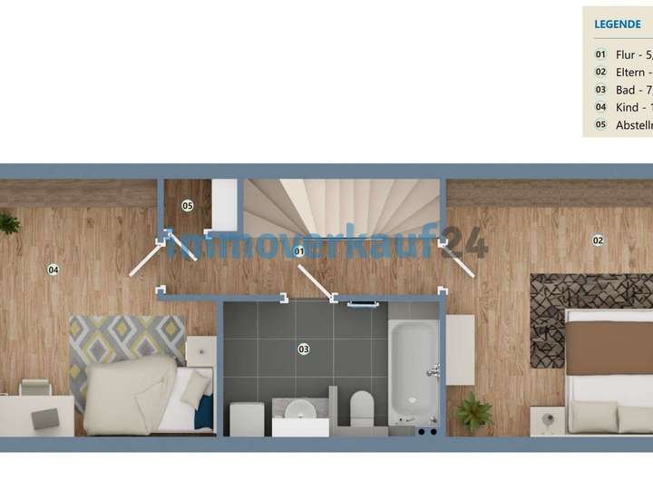 Das Obergeschoss verfügt über etwa 42,10 m² Wohnfläche und bietet ein komfortabel ausgestattetes Badezimmer sowohl mit Dusche als auch mit Badewanne. Zwei weitere, geräumige Zimmer sowie eine praktische Abstellkammer für Haushaltsgeräte gewährleisten eine funktionale Raumaufteilung auch auf dieser Ebene.