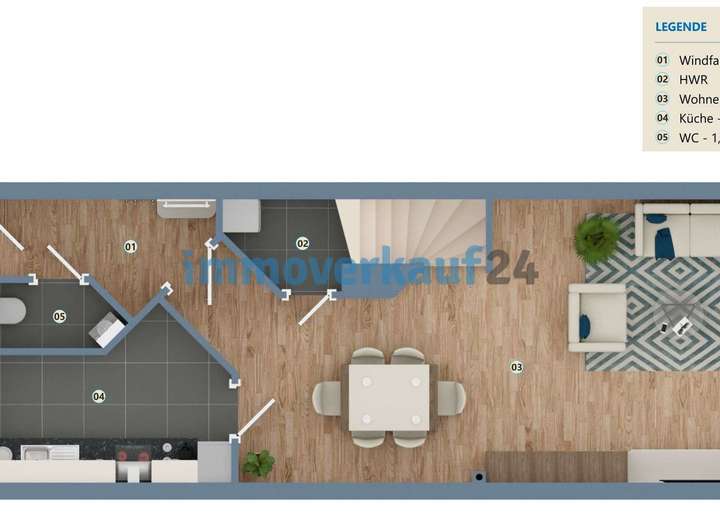 Auf ca. 42,70 m² Wohnfläche im Erdgeschoss befindet sich der großzügig gestaltete Wohn- und Essbereich, welcher den Lebensmittelpunkt der Familie darstellt und unmittelbaren Zugang zu Terrasse und Garten bietet. Ergänzt wird diese Ebene durch eine moderne Küchenzeile, einen clever unter der Treppe platzierten Hauswirtschaftsraum mit integrierter Gebäudetechnik sowie ein separates Gäste-WC.