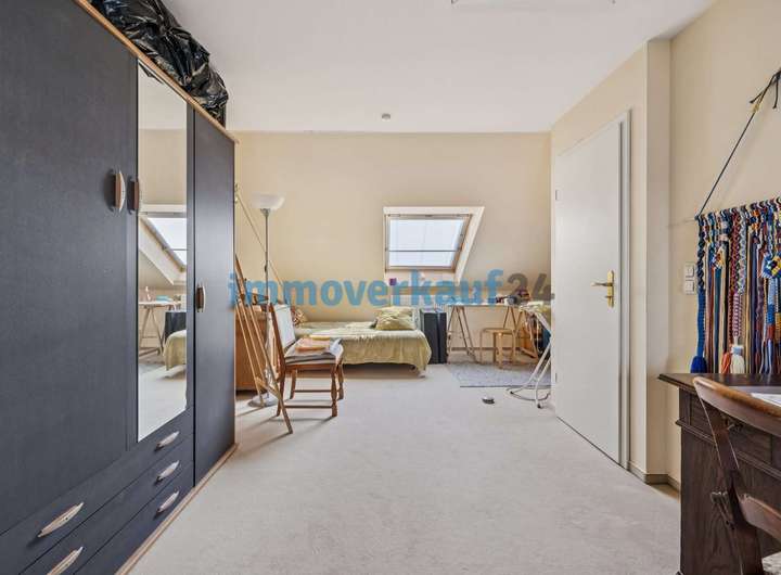 Mit circa 23,75 m² Nutzfläche präsentiert sich das voll ausgebaute Dachgeschoss als charmanter Studiobereich mit großen Veluxfenstern, der einen atmosphärischen Wohlfühlort schafft – bestens nutzbar als Home-Office oder Hobbybereich. Eine Einschubleiter gewährt Zutritt auf den Dachboden.