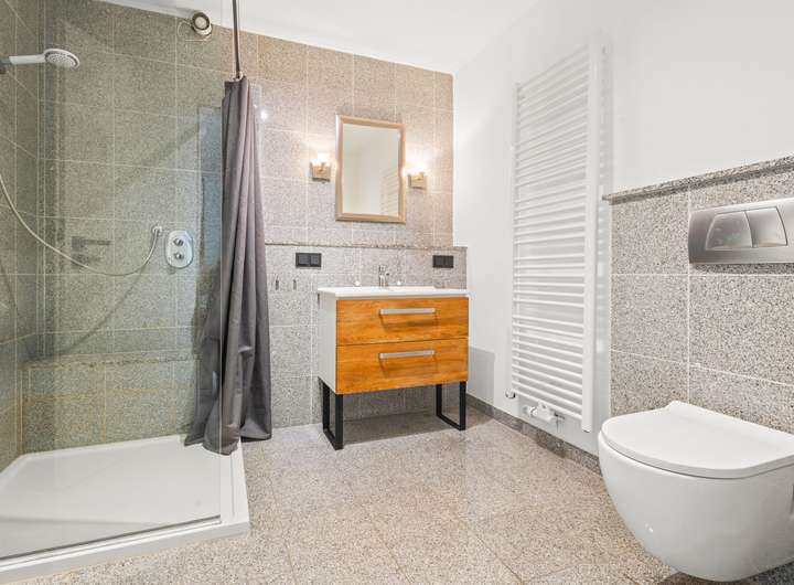 Die Wohnung verfügt über zwei Schlafzimmer, von denen eines ebenfalls Zugang zur Loggia hat. Das modernisierte Badezimmer ist mit einer ebenerdigen Dusche, einem Waschtisch, einem Handtuchheizkörper, einem WC und einer Fußbodenheizung ausgestattet.