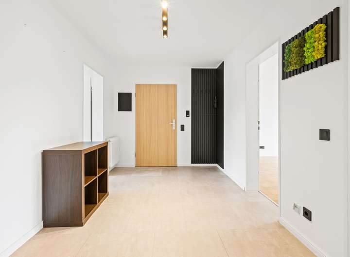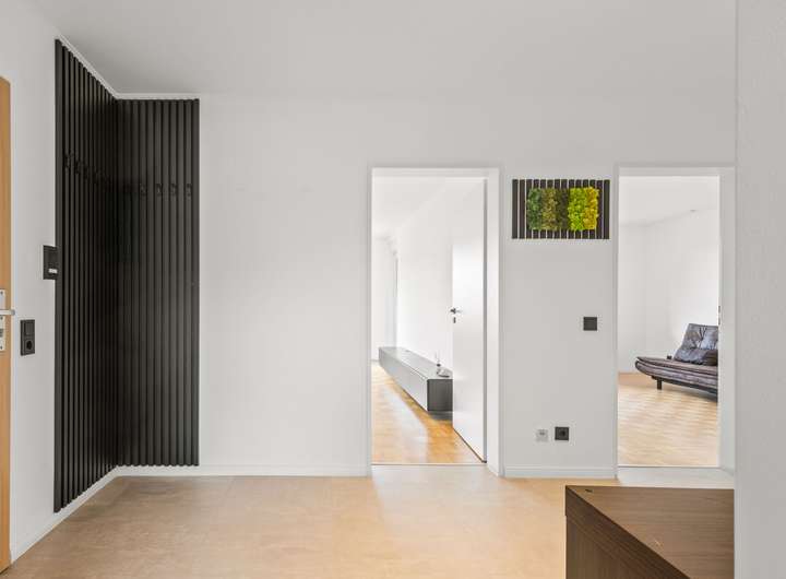 Im Zuge der Modernisierungen wurden zahlreiche Details überarbeitet: weiße Kunststoffrahmenfenster (zum Teil dreifach-verglast) mit erneuerten Rollläden, aufbereitete Parkettböden, Vinylboden im Flur, geweißte Wände und weiße Innentüren. Die Decke wurde gedämmt, abgehängt und mit integrierten LED-Spots ausgestattet. Anthrazitfarbene Steckdosen- und Lichtschalterabdeckungen setzen dezente Akzente. Auch die Wohnungseingangstür wurde erneuert und mit einem Türspion ausgestattet. Das Flachdach des Gebäudes wurde 2021 saniert.