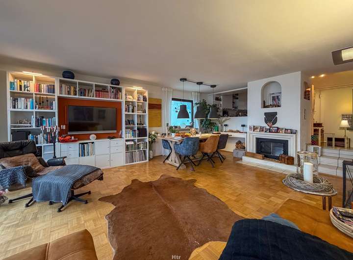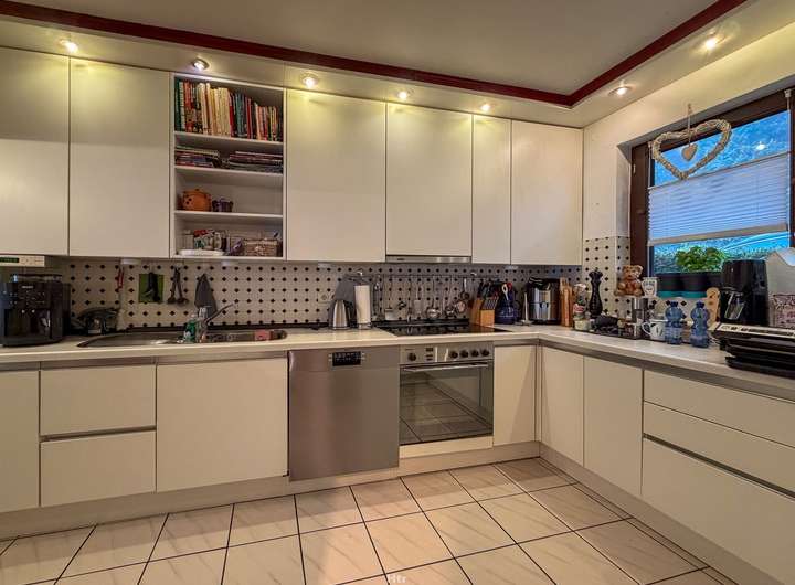 Die gehobene Ausstattung des Hauses lässt keine Wünsche offen: Eine hochwertige Einbauküche bildet das Herzstück des Hauses, während der Parkettboden im Wohnzimmer für ein behagliches Ambiente sorgt. Genießen Sie erholsame Stunden auf der Terrasse oder dem Balkon mit herrlichem Skylineblick. Die untere Etage mit eigenem Bad und Zugang von aussen bietet sich gut als Homeoffice oder eigenen Bereich für einen Teenager an.