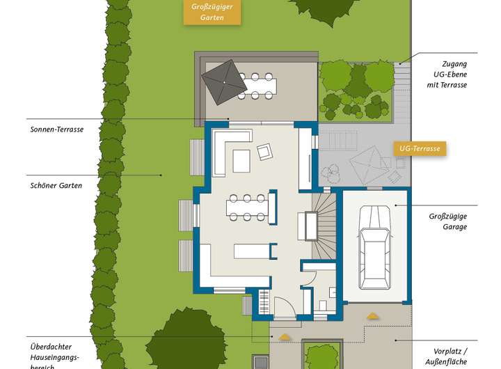 + Attraktiver Wohnraum, ideal für Gäste oder Home-Office mit Zugang zur Terrasse + Großzügige Terrasse - sehr idyllisch mit einem individuell gestaltbaren Pflanzbeet als Begrenzung zum Garten