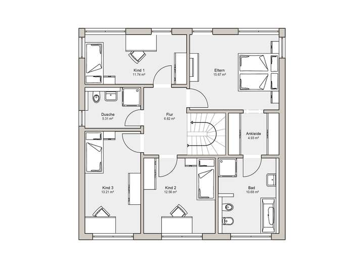 Im Obergeschoss sind die Individualräume angeordnet: Drei Kinderzimmer mit separatem Duschbad und das Domizil für die Eltern mit luxuriöser Ankleide als Zugang zum separatem Eltern-Bad bieten maximalen Wohnkomfort.