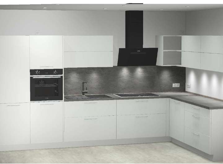 Nolte-Einbauküche mit Siemens-Geräten, Dunstabzug über Außenwand