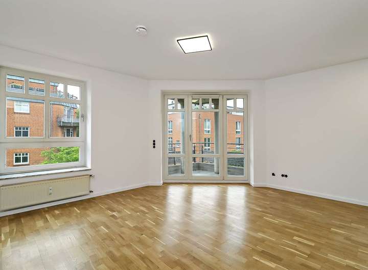 Die zwei Zimmer sind angenehm hell und bieten durch den Einsatz von Parkett einen wohnlichen Charme. Für zusätzlichen Komfort sorgt ebenfalls die voll ausgestattete Einbauküche. Der Balkon mit Blick auf die Dahme rundet das Ensemble ab.