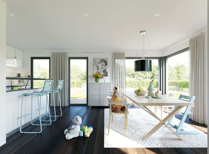 Dieses elegante Fertighaus im modernen Bauhausstil bietet dir und deiner Familie auf zwei Etagen nicht nur 10 Zimmer, sondern auch das perfekte Ambiente für ein harmonisches Familienleben. Die klare Linienführung und das innovative Flachdach verleihen dem Haus eine zeitgemäße Ästhetik, während der großzügige Rechteckerker für einen lichtdurchfluteten Wohnraum sorgt. Hier erwartet dich ein großes Schlafzimmer mit einer praktischen Ankleide, die den Übergang zu einem überdachten Freisitz bildet - ideal für entspannte Morgenstunden in deinem Pyjama. Im Obergeschoss findest du zwei kinderfreundliche Zimmer, die durch den Erker nicht nur mehr Platz, sondern auch einen eigenen Balkon bieten. Auf insgesamt 223 Quadratmetern Wohnfläche und einem Grundstück von 750 Quadratmetern hast du genügend Raum, um deine persönlichen Wohnideen zu verwirklichen. Mit LivingHaus hast du die Möglichkeit, dein Zuhause nach deinen Wünschen und Vorstellungen zu gestalten und zu projektierten. Neben der individuellen Planung erwartet dich eine Reihe von zusätzlichen Leistungen, die dein Bauvorhaben stressfrei und effizient gestalten. Die hochwertige Traumküche von LivingHaus wird passgenau für deinen Grundriss entworfen und punktet mit modernster Technik und cleveren Stauraumlösungen. Das LivingHaus Bau-Cockpit ermöglicht dir den digitalen Überblick über dein Bauprojekt - von der Dokumentenverwaltung bis hin zum Zeitplan. Mit I-KON - Intelligentes Bauen kannst du dein Zuhause nachhaltig gestalten, während das Zuhause-Darlehen dir eine günstige Finanzierung ermöglicht. Das Zuhause-Paket bietet dir eine hochwertige Grundausstattung, und beim DIY-Ausbau-Coaching lernst du, wie du deinen Innenausbau selbst umsetzen kannst. Mit LivingHaus wird der Weg zu deinem Traumhaus leicht und individuell!