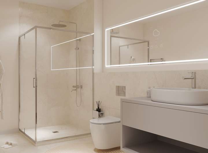 - Bodengleiche Duschen mit ESG-Glastrennwand