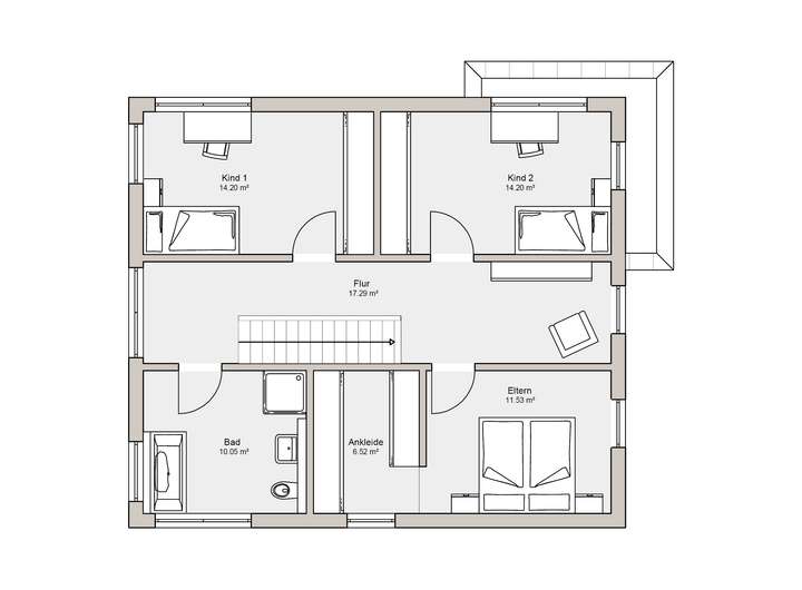 Der Flur wird durch zwei bodentiefe Fensterelemente auf beiden Seiten des Hauses lichtdurchflutet. Vom Flur aus haben Sie Zugang in die Zimmer des Dachgeschosses. Die beiden Kinderzimmer sind mit rund 14 Quadratmetern gleich groß. Das Elternschlafzimmer verfügt über eine eigene Ankleide. Das Familienbadezimmer besitzt neben einer Dusche auch eine Badewanne und ist rund zehn Quadratmeter groß. Hingucker auf der Eingangsseite ist das große Fensterelement über der Tür, das den Flur im Dachgeschoss hell erstrahlen lässt.
