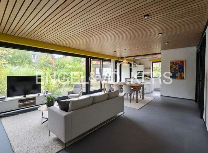 Der offene Wohn- und Essbereich mit großer Fensterfront und direktem Zugang zur Sonnenterrasse bildet das Herzstück des Hauses. Mehrere flexibel nutzbare Räume, ein Schwimmbad mit Sauna sowie drei Terrassen schaffen ein besonderes Wohngefühl mit viel Komfort und Privatsphäre.