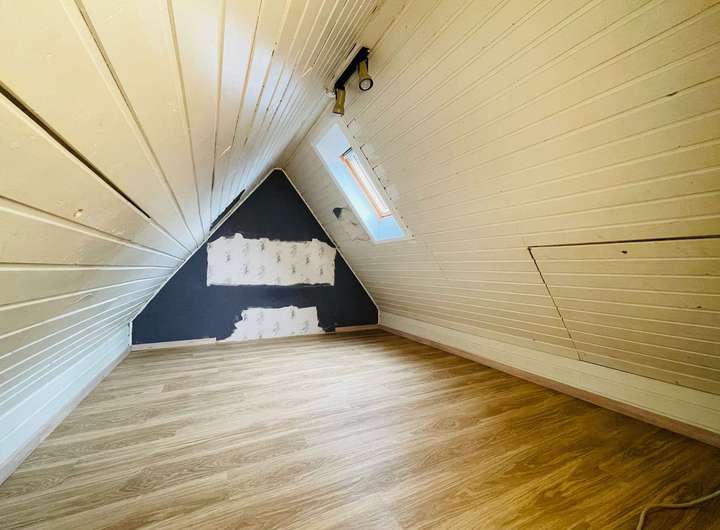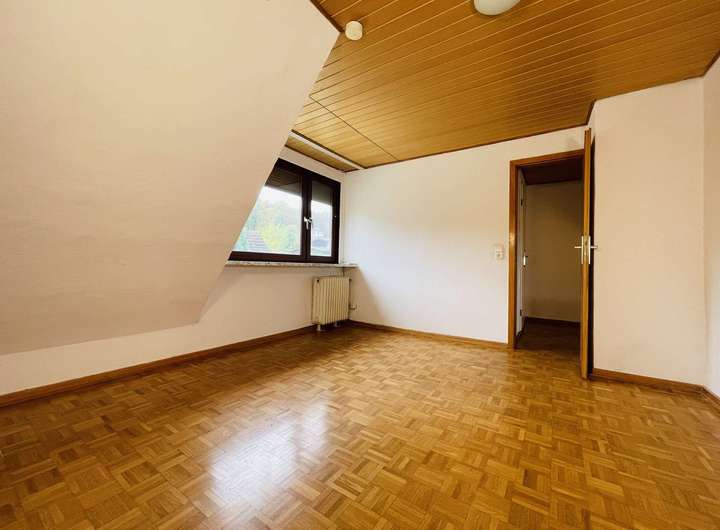 Im Obergeschoss befindet sich das moderne Wannenbad, das 2020 erneuert wurde und mit hochwertigen Elementen ausgestattet ist. Das Schlafzimmer wirkt durch die Gaube angenehm großzügig. Direkt daneben liegt ein weiterer Raum, der sich gut als Kinderzimmer, Büro oder Ankleide eignet. Über eine Treppe erreichen Sie den ausgebauten Spitzboden, der zusätzlichen Stauraum bietet.