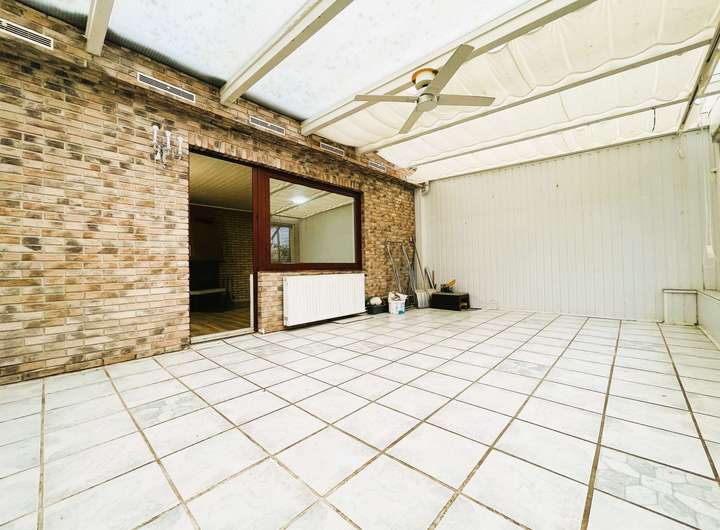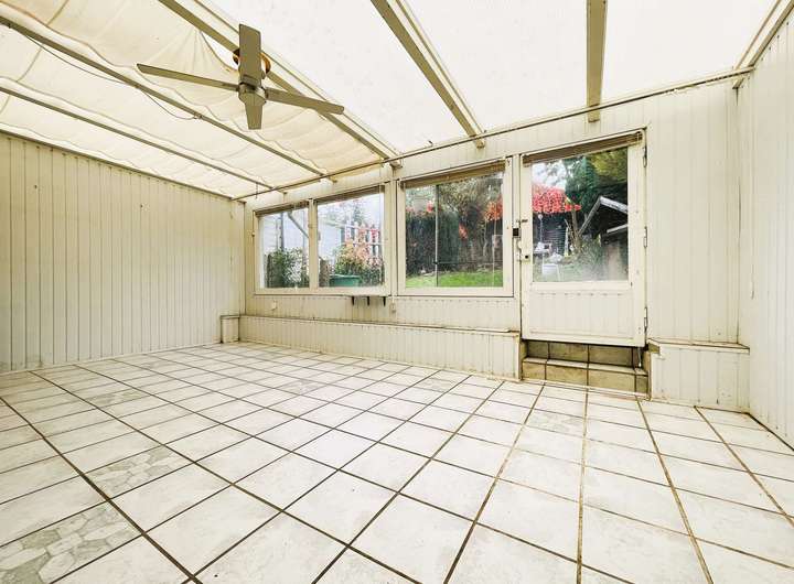 - Großer, gefliester Wintergarten mit Blick in den Garten