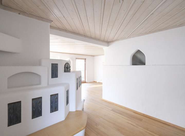 Herzstück dieser beiden Räume ist der schlicht weiße Kaminofen mit Sitzbank. Er bereitet eine