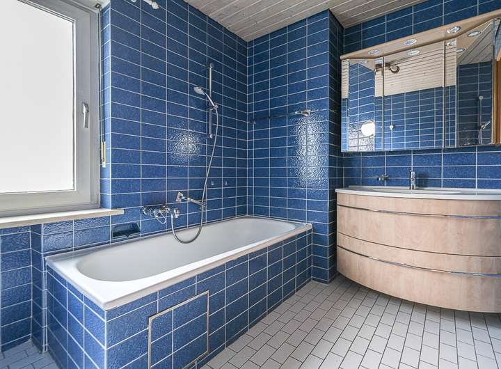Waschtisch ausgestattet ist das blau geflieste Tageslichtbadezimmer.