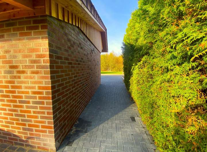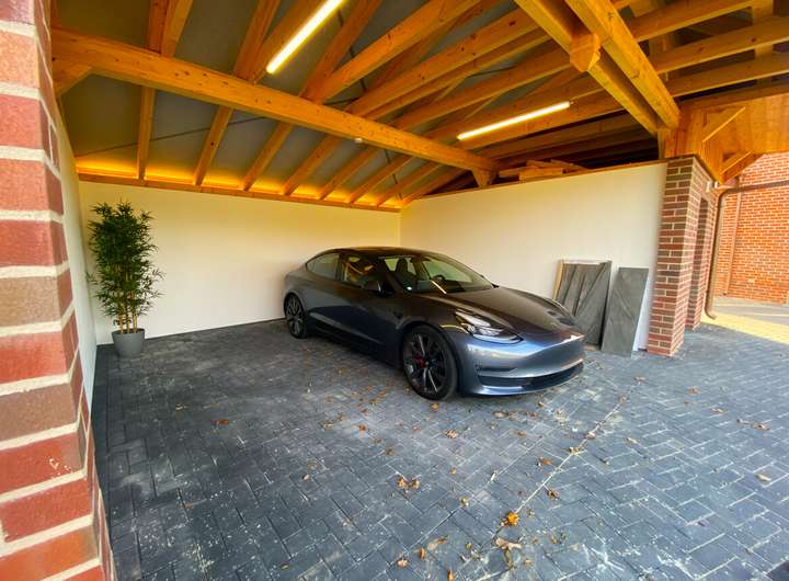Vor dem Haus befinden sich Stellplätze sowie ein massives Carport für zwei Fahrzeuge. Der integrierte Nebenraum verfügt über Stromanschlüsse, die bei Bedarf getrennt genutzt werden können.