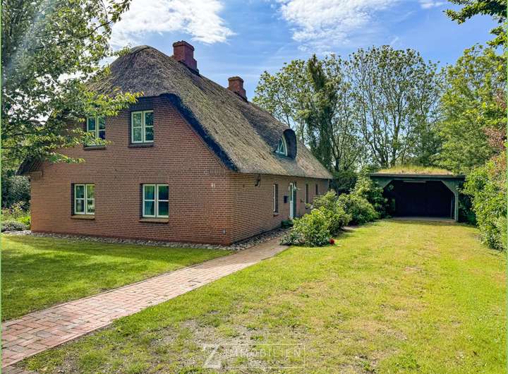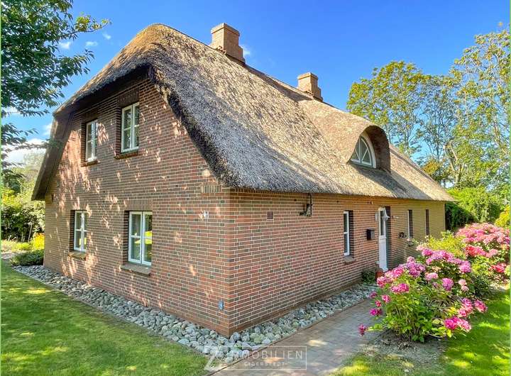 Dieses charmante Reetdachhaus aus dem Jahr 1995 liegt idyllisch im ruhigen Wasserkoog auf der Halbinsel Eiderstedt. Auf einem ca. 1.200 m² großen Grundstück bietet es eine Größe von ca. 174m², die sich auf zwei Etagen verteilen. Die gemütliche Ausstattung mit Kachelofen, offener Holzbalkendecke und Holzsprossenfenstern unterstreicht den norddeutschen Landhausstil.
