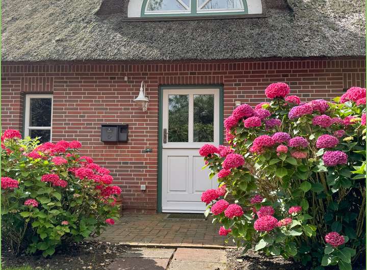 Schon beim Ankommen wird klar, hier stimmt die Atmosphäre. Hortensien säumen den Weg, alte Bäume und Sträucher schützen das Haus und bieten Privatsphäre, während Blumenbeete den Eingangsbereich farbenfroh in Szene setzen. Eine klassische Holzsprossentür empfängt Sie – typisch friesisch, charmant und einladend.