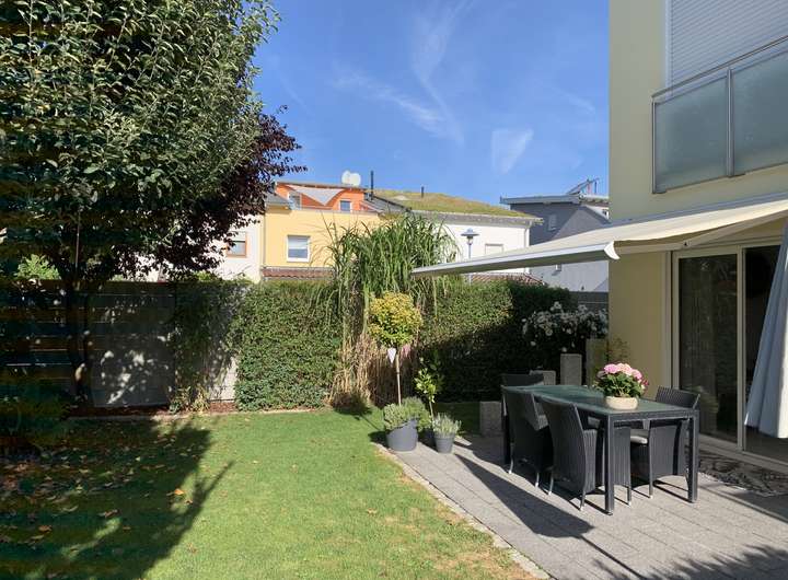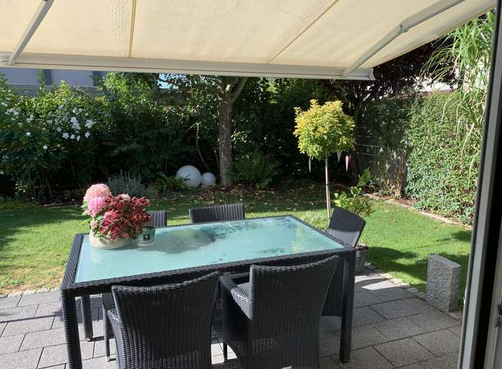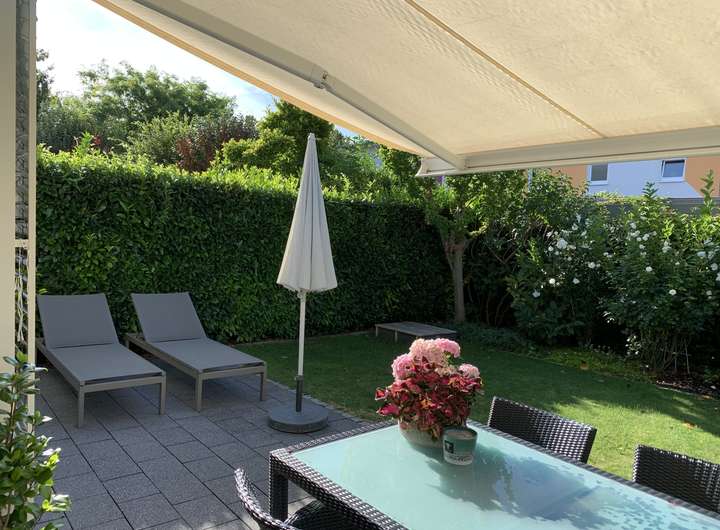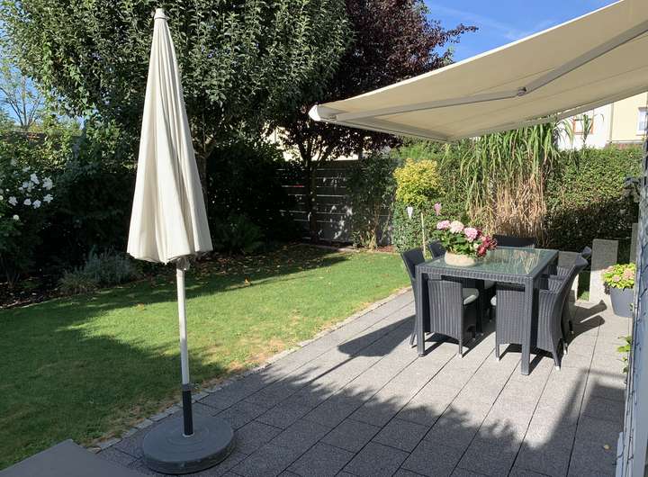 Der Außenbereich überzeugt mit einem eigenen, vollständig eingegrenzten Garten, der viel Privatsphäre bietet. Die sonnige Terrasse lädt zu entspannten Stunden und geselligen Abenden ein. Zwei Stellplätze im Carport runden das attraktive Gesamtangebot ab.