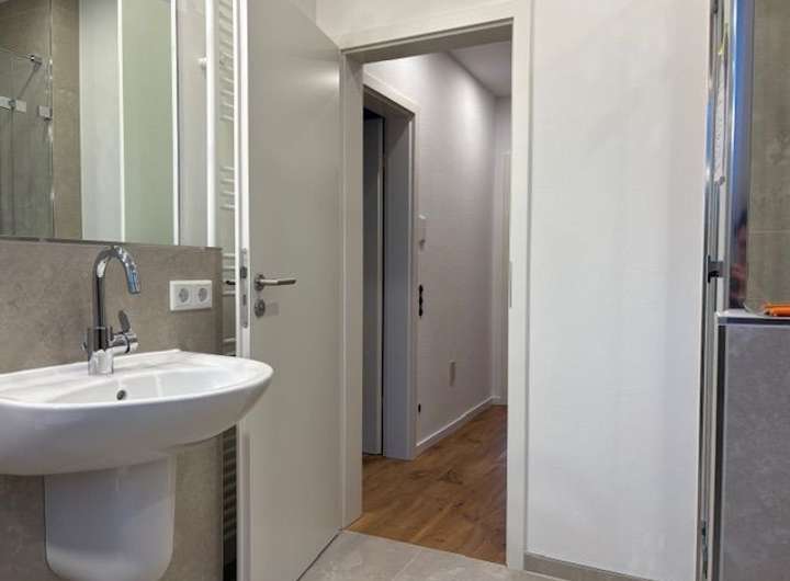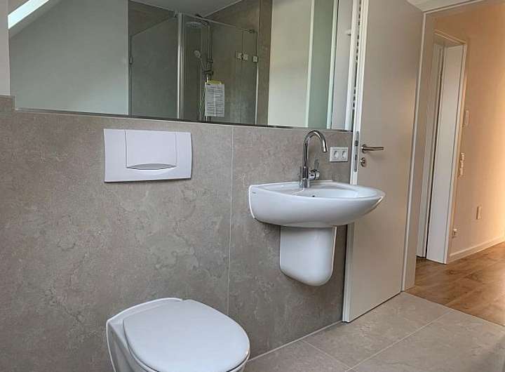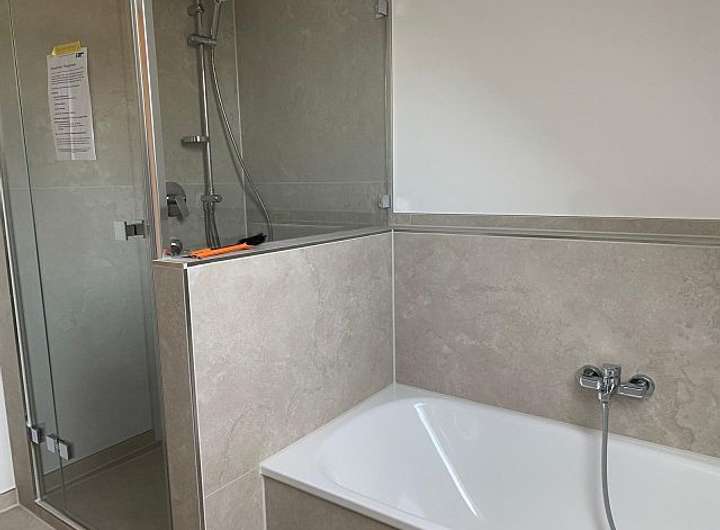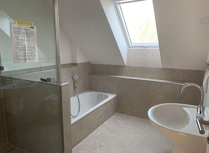 - Bad 1. OG (neu in 2025) mit Fenster: Badewanne, Dusche mit Glaswand und -tür, WC, HWB, Fliesenplatten in betongrau (warmer Farbton), verschiedene Höhen gefliest, Handtuchheizkörper, großer Spiegel