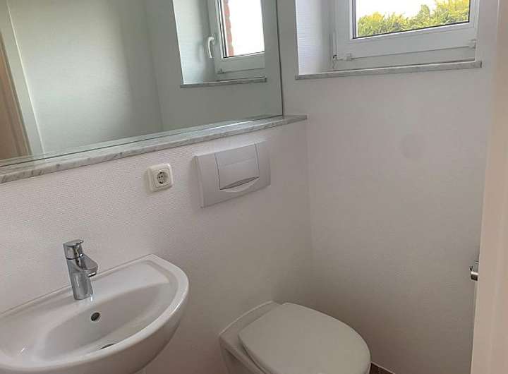 - Gäste-WC (neu in 2025) mit Fenster: WC, HWB, großer Spiegel, Wände mit Strukturtapete, weiß gestrichen