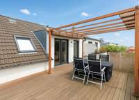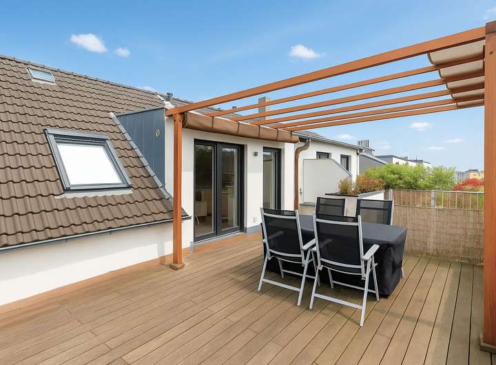 Ein besonderes Merkmal ist die großzügige Dachterrasse mit Westausrichtung und Pergola. Der Ausblick ist unverbaubar und geprägt von viel Grün sowie ansprechender Nachbarbebauung.