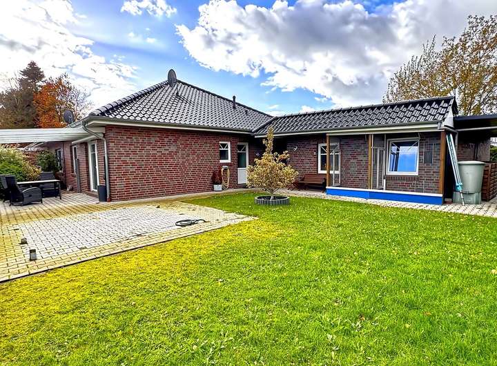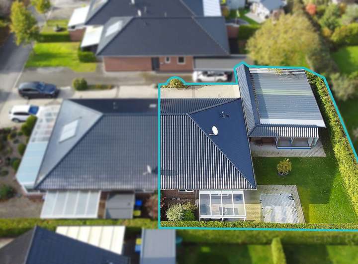 Ebenerdige Bungalowhälfte mit großer Doppelgarage und integrierter Werkstatt