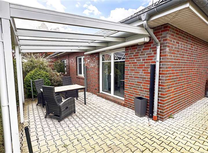 Ein weiteres Highlight ist die überdachte Terrasse aus Aluminium mit einer zusätzlichen Markise, die an sonnigen Tagen angenehmen Schatten spendet. Der Nebeneingang ermöglicht einen praktischen Zugang zum Garten oder Hauswirtschaftsraum. Der pflegeleichte Garten lädt zum Verweilen und Entspannen ein.