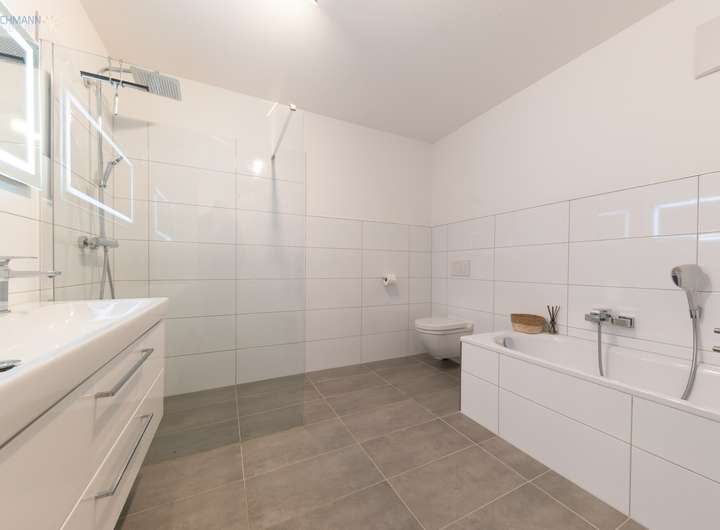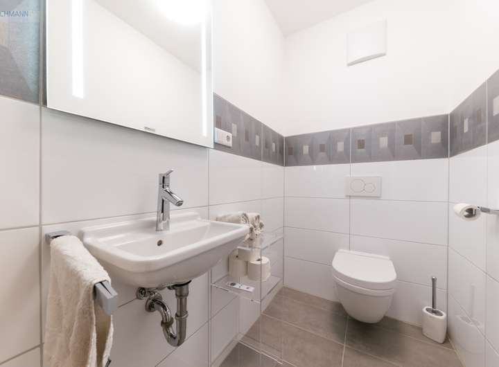 Das stilvolle Hauptbad präsentiert sich mit einer hochwertigen Ausstattung, einer komfortablen Badewanne sowie eleganten Armaturen. Eine integrierte Lüftungsanlage sorgt für optimale Belüftung und ein dauerhaft angenehmes Raumklima. Ergänzt wird der Komfort durch ein separates Gäste-WC. Ein praktischer Hauswirtschaftsraum mit Waschmaschinenanschluss schaffen wertvollen Stauraum und machen den Alltag besonders komfortabel.