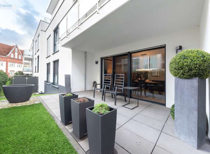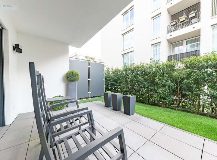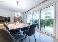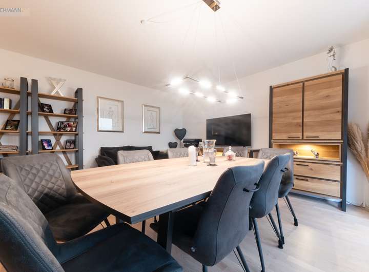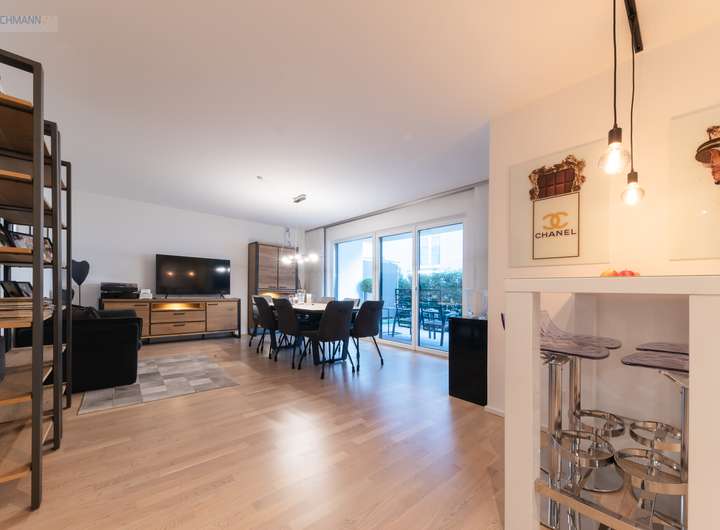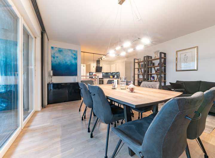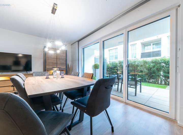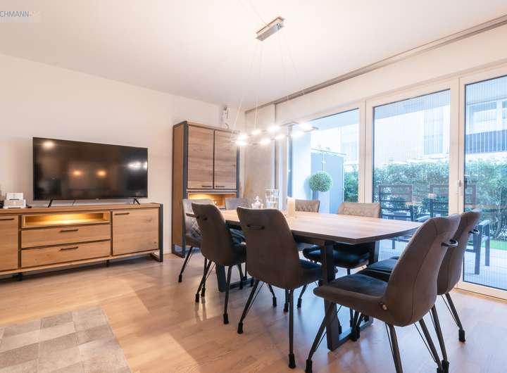 Der großzügige Wohn- und Essbereich mit offener Küche bildet das kommunikative Zentrum der Wohnung. Weitläufige Fensterfronten mit elektrischen Rollläden sorgen für eine helle, einladende Atmosphäre und eröffnen zugleich den Zugang zur Terrasse und dem gepflegten Garten – ein privater Rückzugsort, der den Wohnraum erlebbar nach draußen erweitert.