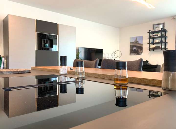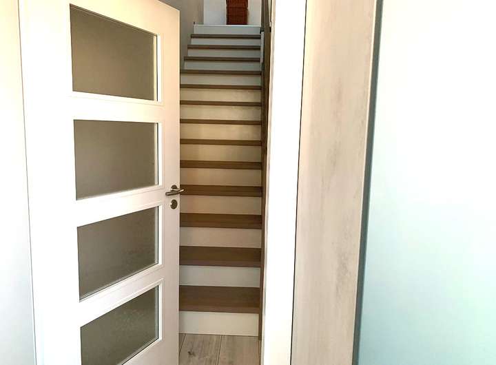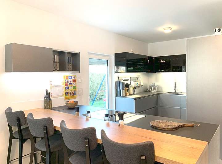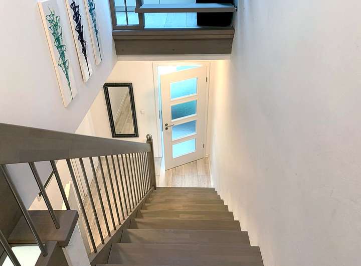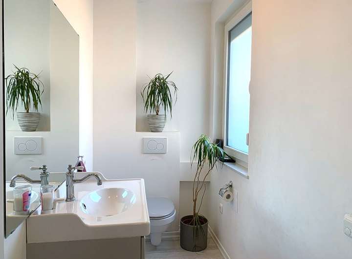 Im Erdgeschoss bietet sich auf dem Flur ausreichend Platz für Jacken und weitere sperrige Garderobe. Ein geräumiges Gäste WC mit Fenster wartet hier auf die neuen Mieter, sowie ein Abstellraum und der große Wohnbereich mit offener Küche. Diese wurde 2017 eingebaut und steht für einen modernen klareren Stil. Von der Küche aus, erreichen Sie auch den Garten der Immobilie.
