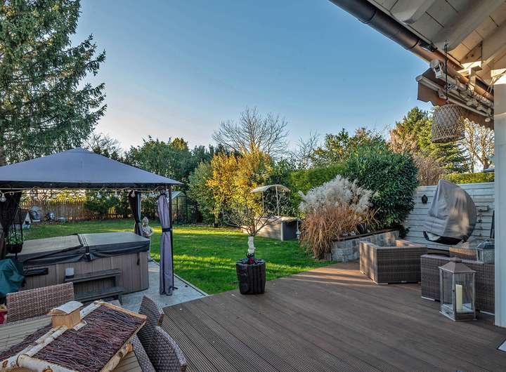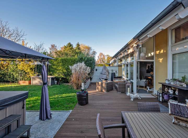 Die weitläufige Südwestterrasse und der vorgelagerten Garten laden dazu ein, die Sonne von vormittags bis zum Sonnenuntergang zu genießen.