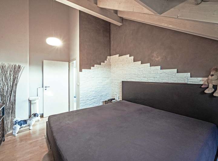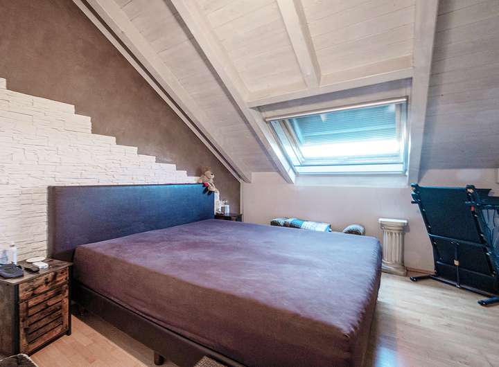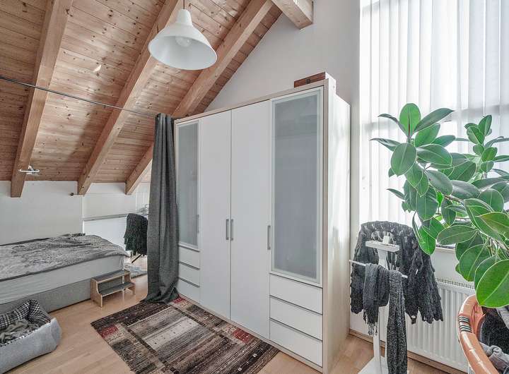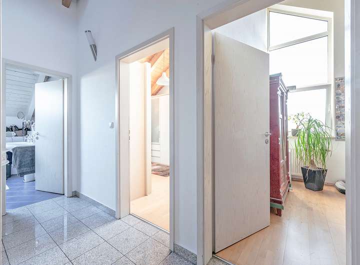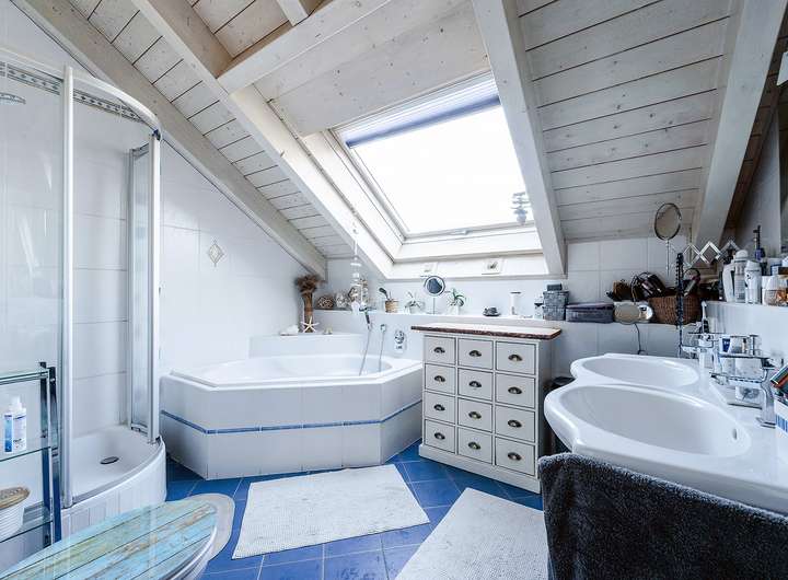 Das Obergeschoss beherbergt ein geräumiges Badezimmer mit Eckbadewanne, Dusche und Doppelwaschbecken sowie das Schlafzimmer und zwei weitere Räume, die flexibel als Kinder-, Arbeits- oder Gästezimmer genutzt werden können. Die Raumhöhen von bis zu über 4 Metern, kombiniert mit den Dachschrägen und dem sichtbaren Dachstuhl, schaffen ein angenehmes und einladendes Wohlfühlambiente.