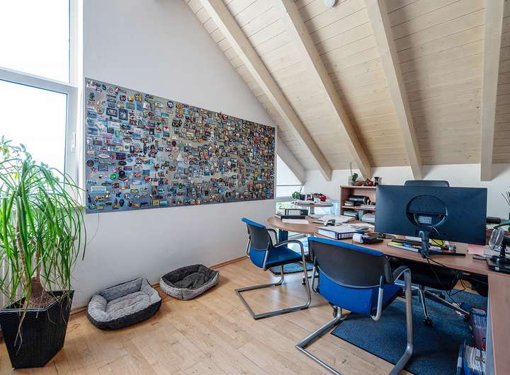 + 3 weitere Zimmer im OG mit Raumhöhen von bis zu über 4 m und Sichtdachstuhl